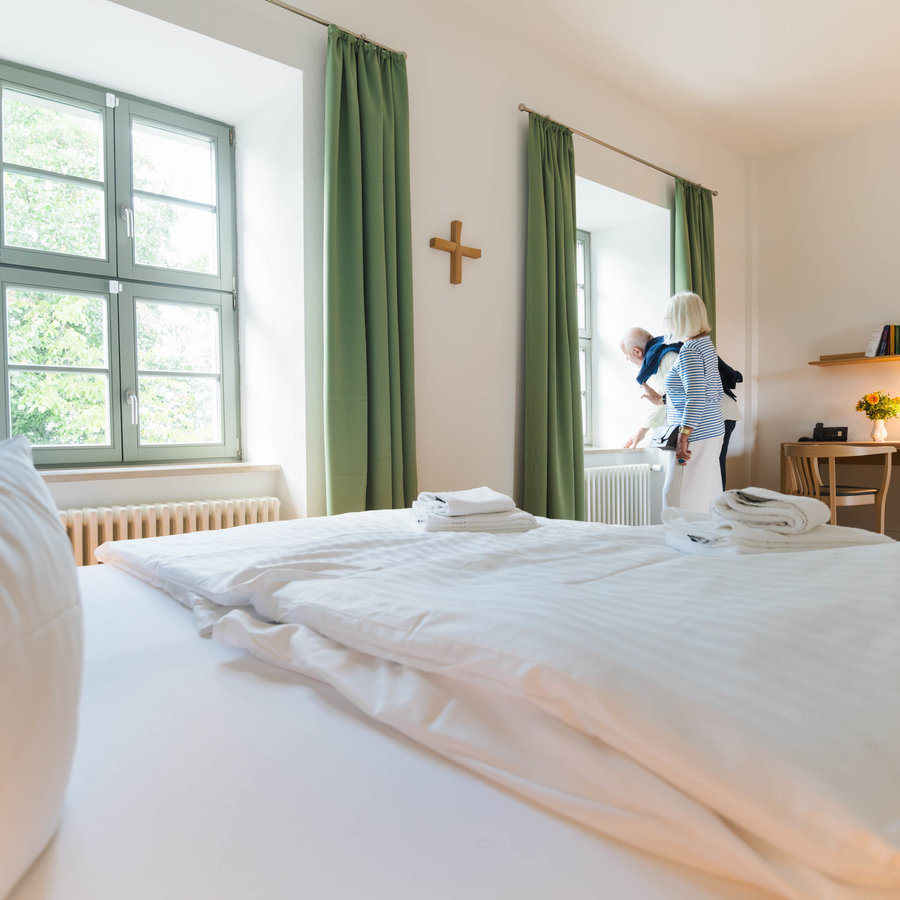 Gastliche Aufnahme finden alle Interessierten im Gästehaus, das in den barocken Gebäudeteilen der Anlage eingerichtet und nach dem Gründerabt Ekkehard († 1084) benannt ist.